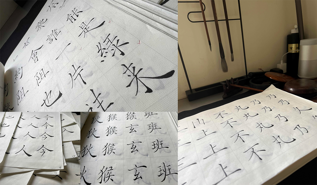 2021年台灣疫情爆發,Olive卻因此迎來一段居家工作時期,最低限度的外出,使她終於得以從繁忙的生活與舟車勞頓中暫時逸離,沉澱身心,開始重拾年少時曾投入過的毛筆書法。她用寫經狼毫小楷和長形格雁皮宣寫經紙,一筆筆、一張張地寫,也用硬筆抓取字體的結構。她試圖從周公流傳於世的少量字跡當中領略詩意感受的緣由,再運用自己的筆法與架構慣性,創造出金蝶體的形貌。