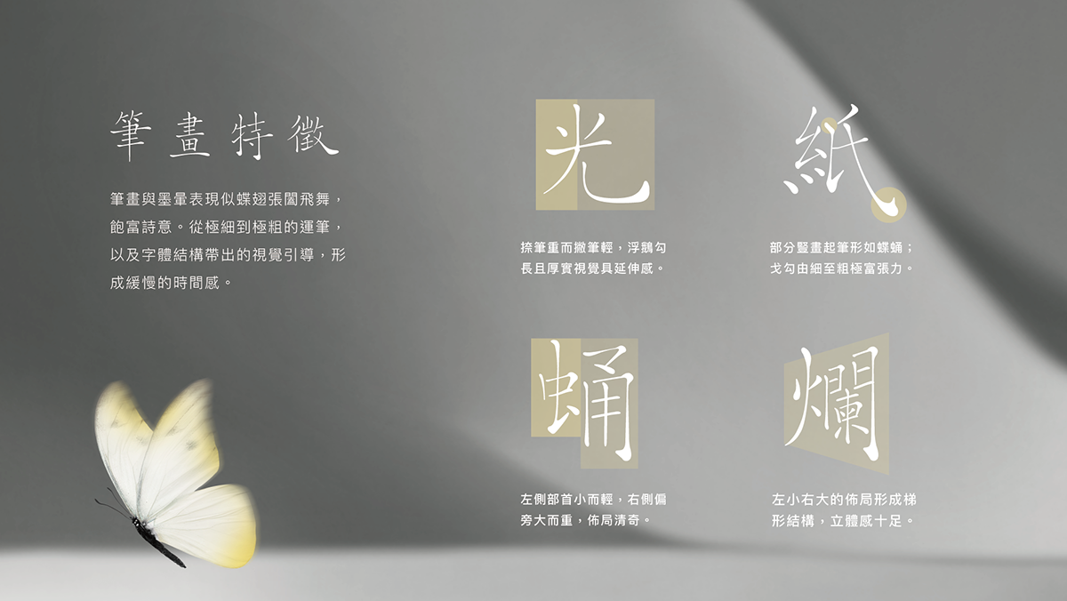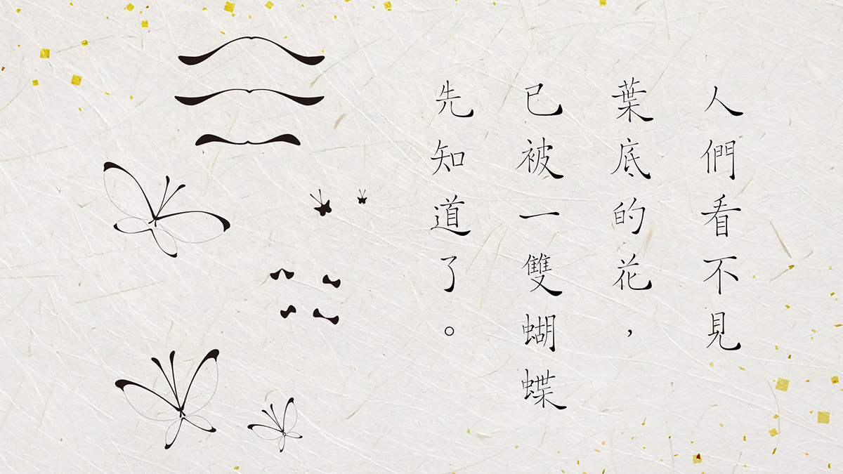 從台灣島嶼詩人周夢蝶的小楷書法手跡中啟發而成,筆畫與墨暈表現似蝶翅張闔飛舞,其素淨內斂、饒富詩意的文字氣質,有如文人靈魂寓居其中,在字裡行間,演奏詩的聲音。