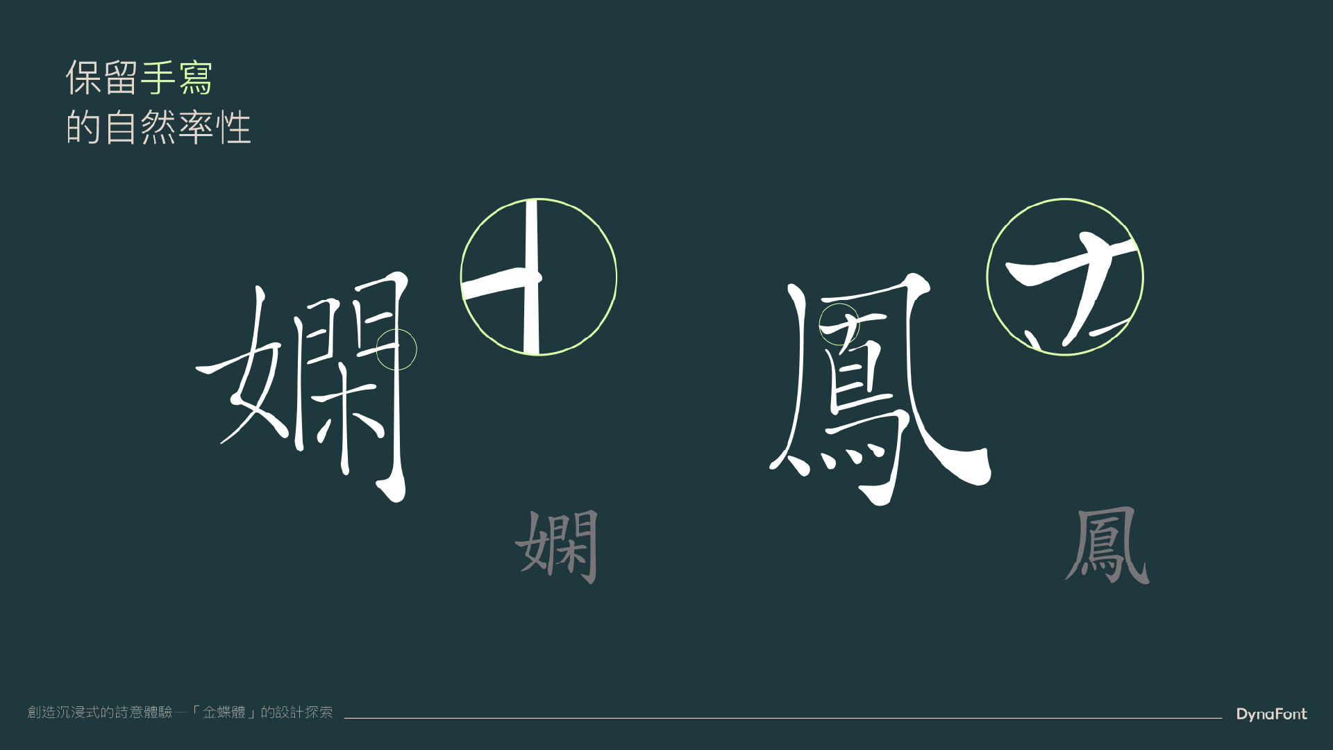 周公的字自有周公的生命境界,《他們在島嶼寫作──化城再來人》片中便紀錄了周公那他人難以模仿的極其緩慢、專注如修行的寫字樣態。Olive雖無法重現,但她擁有自己作為字體設計師對文字的經驗與理解。在創作金蝶體的過程中,她領悟到某種「無技法」的文人字,不談提按折轉、藏鋒出鋒、九宮格上的種種規矩,而將重點放在對字的虔敬與誠懇,盡最大的心力寫好每一個字,即能觸動人心。