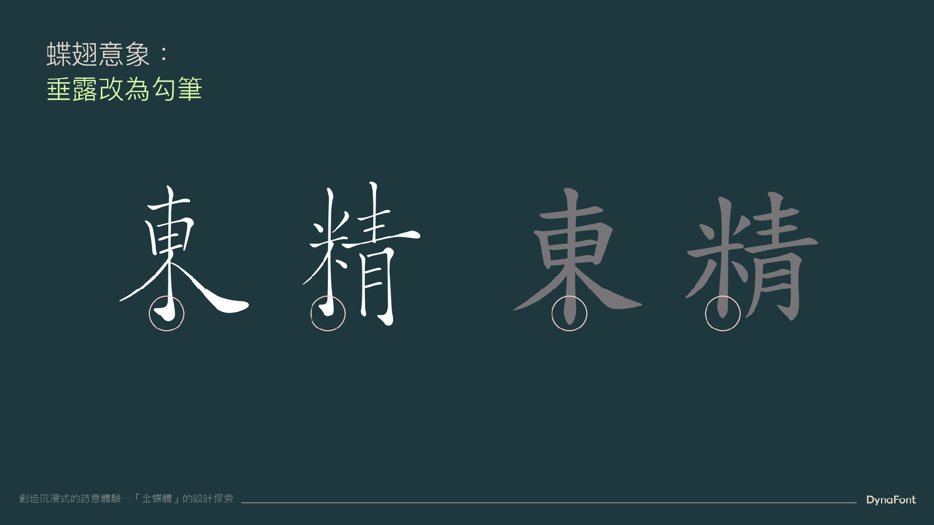 金蝶體的發生既是從對「蝶」的想像開始,由此衍生,Olive先是在字中加入了諸多蝶的意象。不同於其他的楷書字型筆畫重點在於「線」,金蝶體更強調線與面所展開的立體效果。除了字體結構帶來的幾何美學,更透過筆墨從極細至極粗的變化、筆畫末端的濃重墨暈,以及撇、捺的視覺引導,繪製出蝴蝶展翅、蝴蝶收翅的意象。再加上部分筆畫起筆模擬蝶蛹形狀、部分筆畫起筆模擬蝴蝶觸角,而使整套字型自動完成了一幅蝴蝶飛舞、極具生命感的視覺圖景。