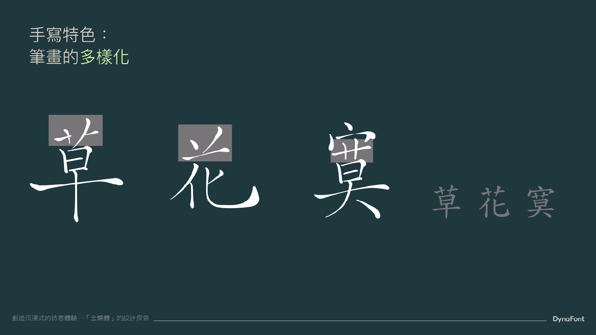 詩人已逝,詩人不遠。就像蝴蝶一生雖短暫易逝,卻在成蟲、成蛹、羽化的過程中如同周而復始般輪迴──金蝶體的誕生,便在此數位時代,重新召喚那舊日的手寫情懷,在無視喧囂的寧靜、悠緩之中,展現生生不息的文字力量。